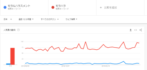 ちなみに「グーグルトレンド」でモラルハラスメントとモラハラを比較するとこんな感じです。
